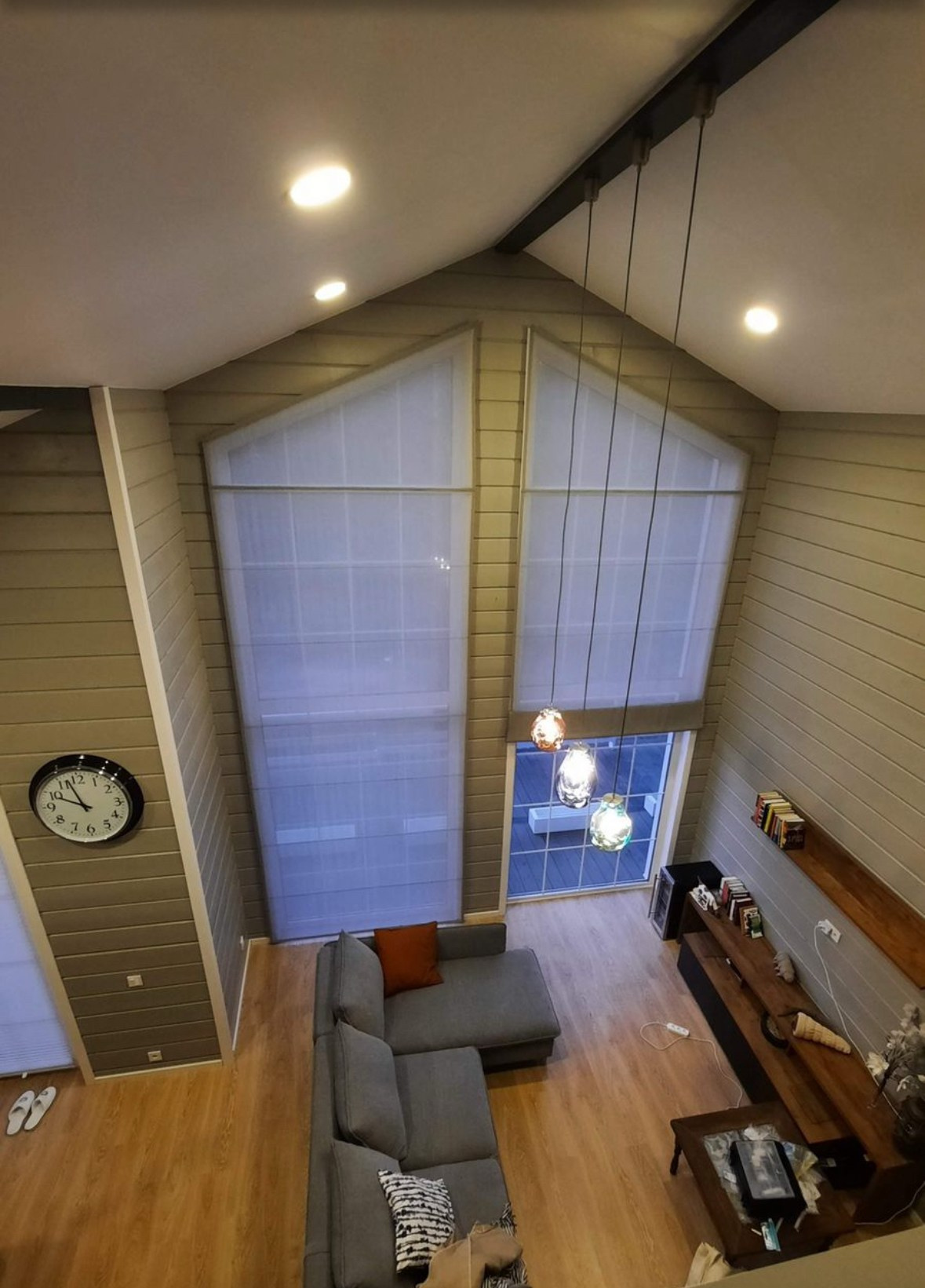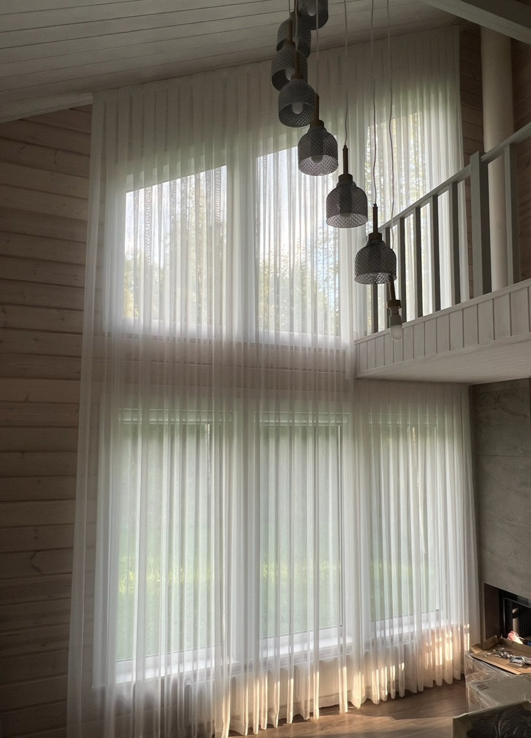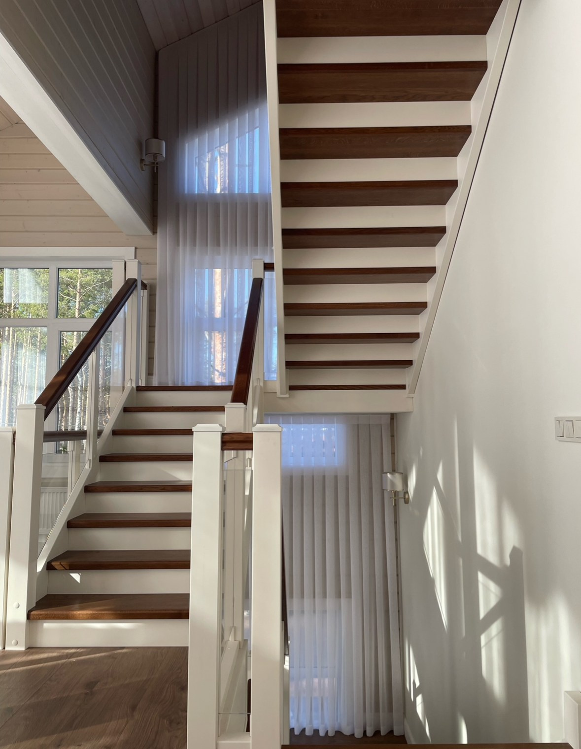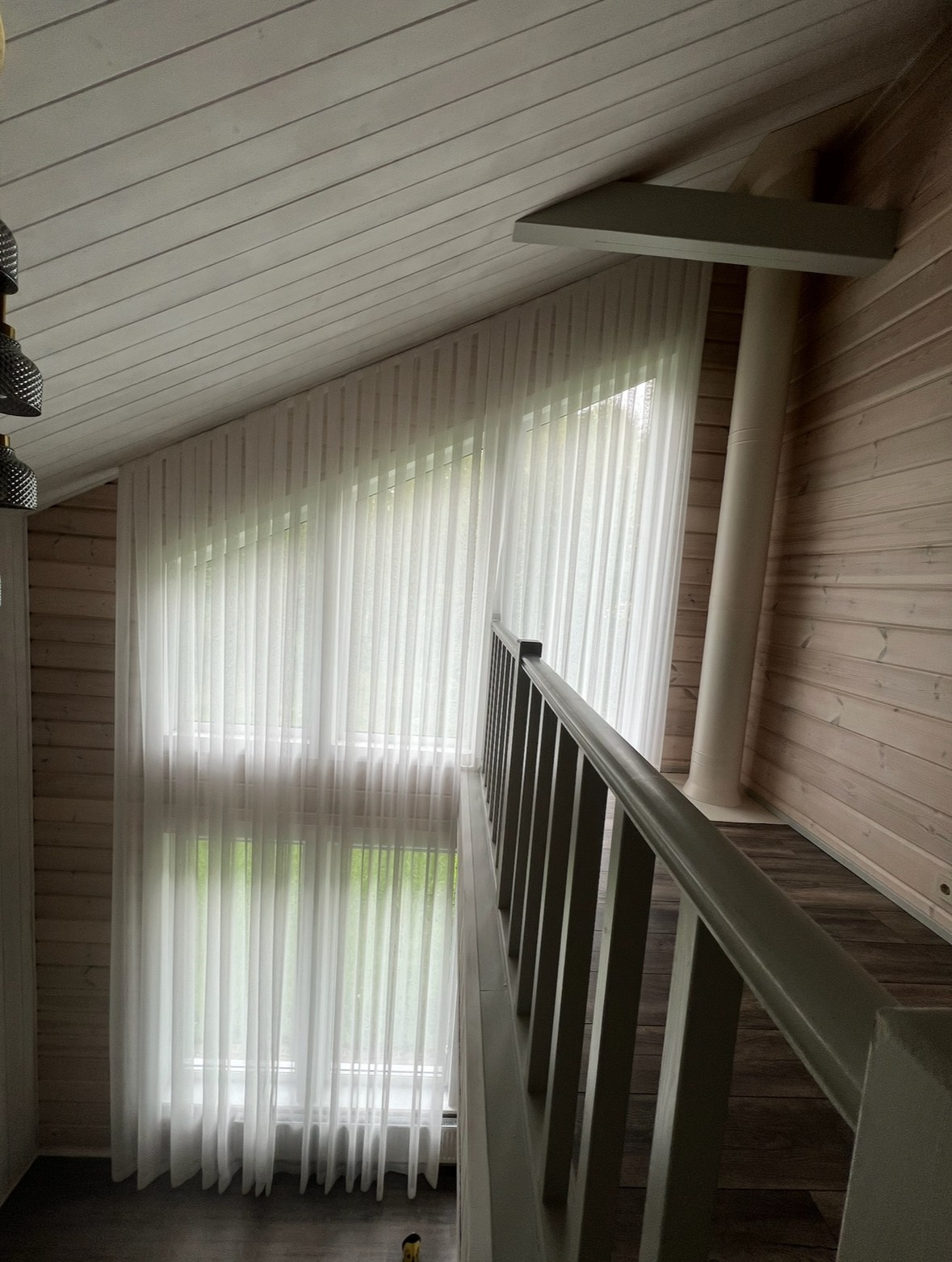 Светлый загородный дом, тюли на косых окнах